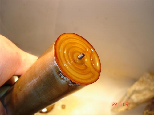 Am anderen Ende läuft der Konstantandraht (Widerstandsdraht) unten an der Halterung entlang. Das sieht man nicht, wenn das untere Stück verschmoddert ist. Beim Reinigen also nicht mit Gewalt den Rost abkratzen, sondern vorsichtig vorgehen. Die beiden Kontakte unten sind zuständig für die Reserve-Warnleuchte. Wenn der Schwimmer ganz nach unten gekommen ist, gibt es Kontakt von der Metallscheibe am Schwimmer, und die Reserve-Warnleuchte im Cockpit wird auf Masse gezogen.