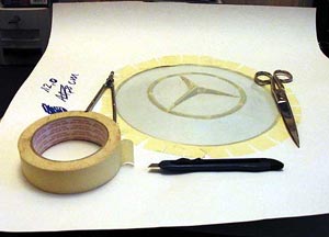 Die erste deckt den äußeren Metallrand ab. Man schneidet das Papier zunächst so zu, daß es den gesamten Raddeckel abdeckt. Sodann schneidet man zentrisch ein kreisförmiges Loch, das einen etwa 3-4 mm größeren Radius hat als die äußerste Lackkante.