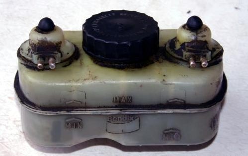• HBZ von der Bremsservo demontieren (O-Ring). Ausgebaut ist er nun, vorsichtig den aufgesteckten Vorratsbehälter vom HBZ abnehmen (sie brechen mitunter gerne, nicht zuviel Gewalt anwenden) und im Ultraschallbad reinigen, Heißwasser Spülbecken und Industriereiniger gehen aber genau so gut. Der hier abgebildete Bendix-Schrott ist nur ein verdrecktes Beispiel: