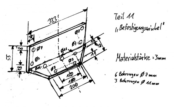 Die Teile 11 Befestigungswinkel und 12 Halteblech haben folgende Maße und sehen im Original wie folgt aus (Skizze Teil 11 nicht maßstäblich, Teil 12 maßstäblich 1:4):