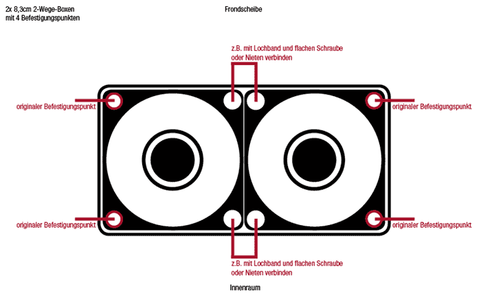 - zwei Boxen im mittig vorgesehen Ausschnitt, dafür muß man diesen natürlich freilegen und ausschneiden und sich die entsprechende Abdeckung besorgen. Ansonsten verfährt man wie bei den zwei Lautsprechern vorne (Stufe 1) oder baut sich einen Hilfsrahmen, der die Boxen von unten hält und mit den originalen Befestiungspunkten verschraubt ist.
