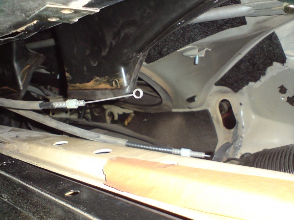 7) Die senkrecht stützende Stange A-Brett <–> Getriebetunnel muss weg, dann auf der rechten Seite des WT die Heizungszüge aushängen.